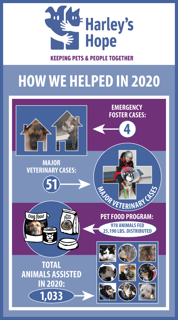 Harley’s Hope was able to rise to the challenges the pandemic created and ramped up an entirely new program to help feed the pets of those affected by the virus and its fallout. Over 25,000 lbs. of food and other pet supplies were delivered to high-risk pet parents or distributed via our monthly drive-up pet food pantries, between April 1 and December 31st, through our Emergency Pet Food Program. That’s a lot of kibble, but to be able to increase the number of pets and people helped during a pandemic meant the world to us.