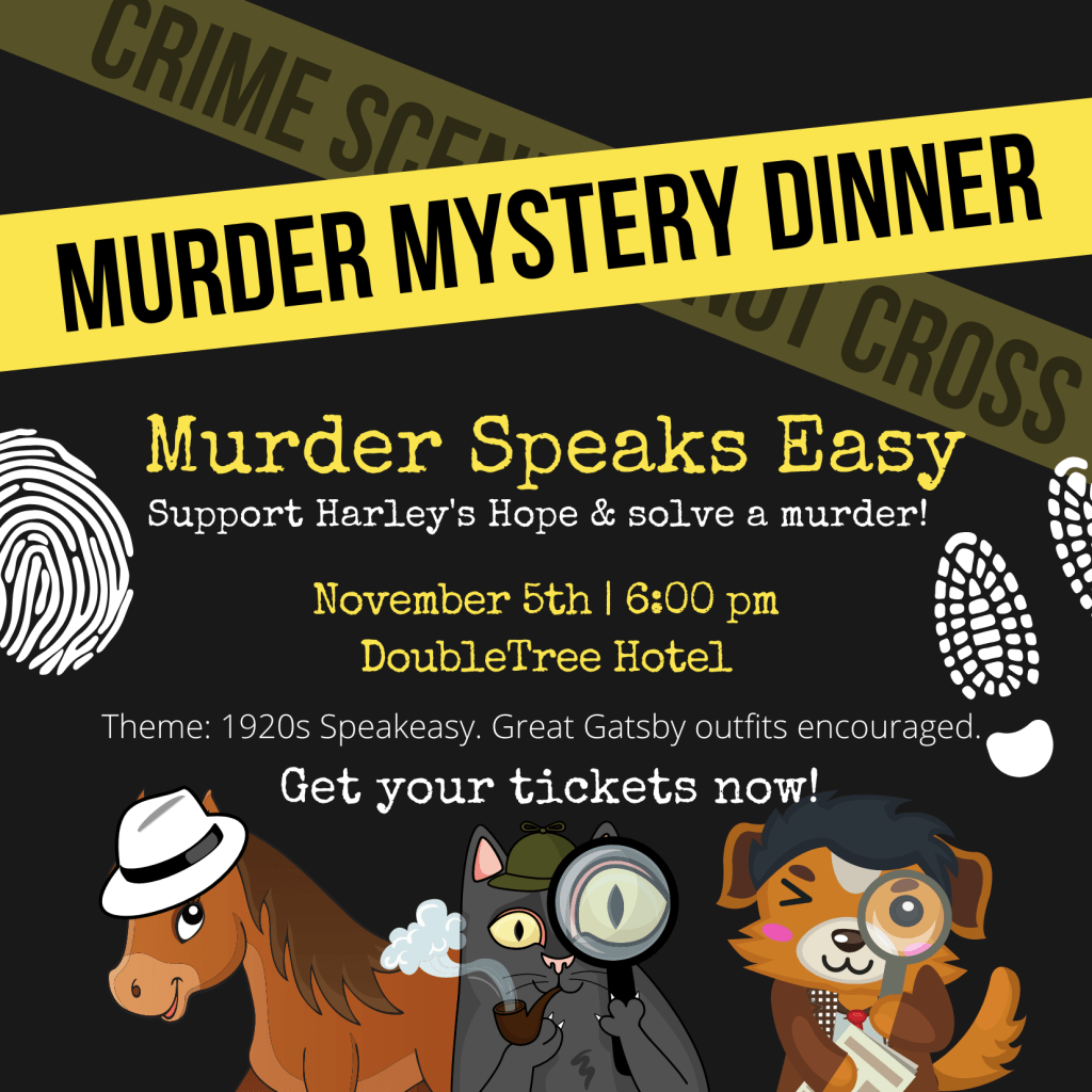 We are so excited to announce a special joint event next month. HHF is partnering with Safe Place for Pets and Elite Equine Rescue to host Murder Speaks Easy! on Saturday, November 5th. Join us at the DoubleTree by Hilton for dinner, a silent auction, swag bags, a cash bar, and…..murder! Yes, someone will die and you get to help solve the mystery. Tickets are limited and going fast. Get your while they are still available at https://buytickets.at/harleyshope/754189.