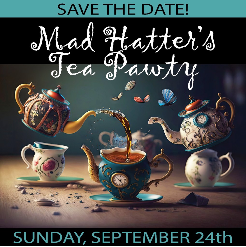We’re all mad here! Won’t you join us? Harley’s Hope and Safe Place for Pets are hosting a Mad Hatter’s Tea Pawty on Sunday, September 24th at the Red Rocks Barn. Join us for a three-course, royal afternoon tea buffet with a glass of bubbly for those over 21. Sandwiches, scones, and sweets, oh my! Plus tea, soft drinks, door prizes, and the chance to compete for awards for those in costume. Come dressed as your favorite Mad Hatter character. Come dressed as yourself. Just don’t come late for this very important date!